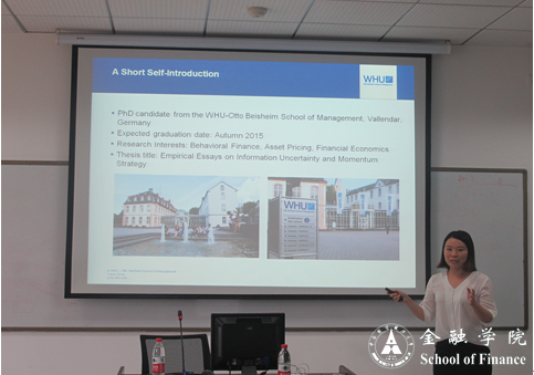随后,由王媚教授的学生龚玉晶博士讲解其名为“Impacts of Ambiguity Aversion and Information Uncertainty on Momentum:An International Study”的博士论文。龚玉晶博士的论文是以全球市场为背景,针对firm size,firm age,以及overconfidence等方面进行分类,通过对公司在股票市场上的表现的实证分析,研究信息不确定性与惯性投资。