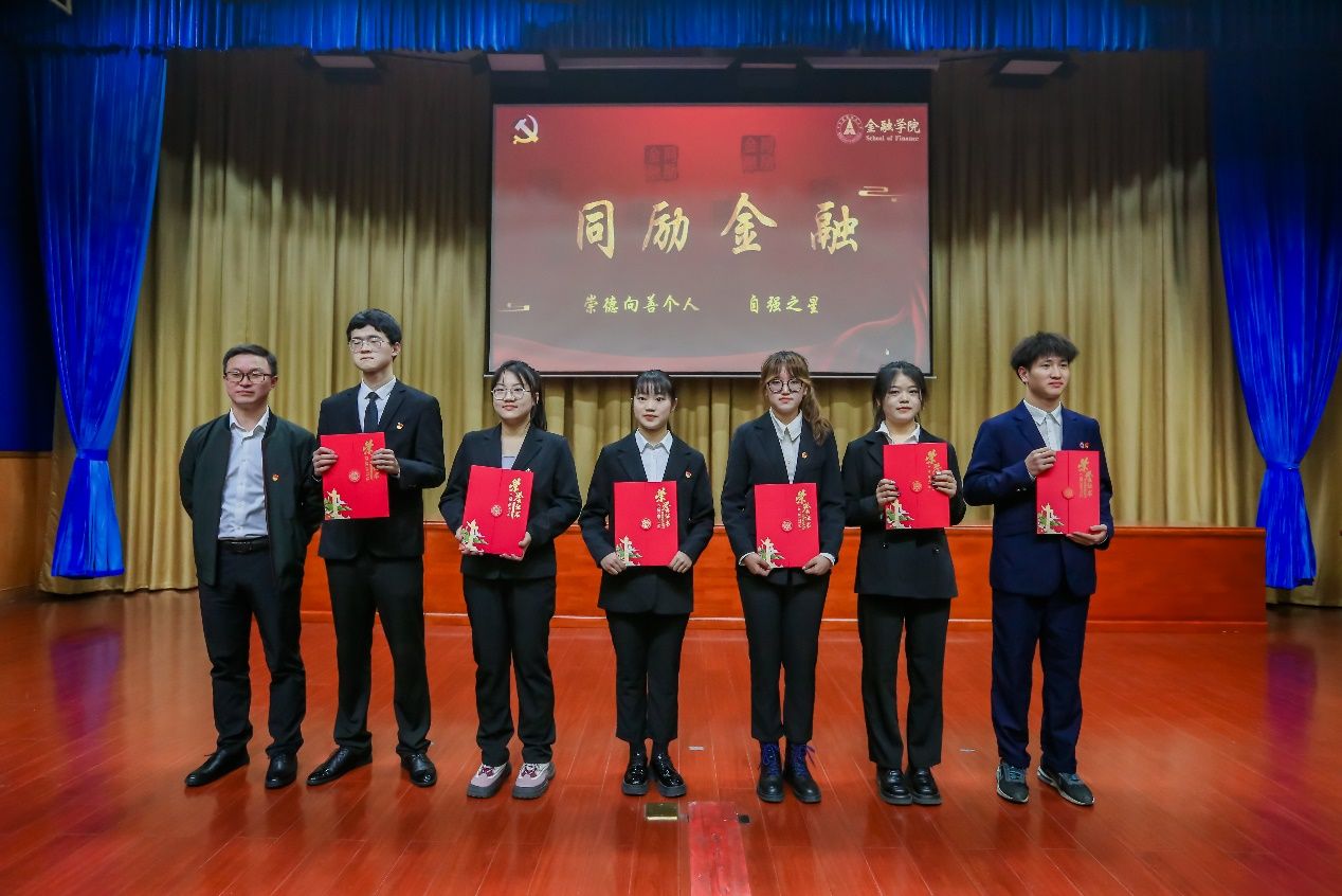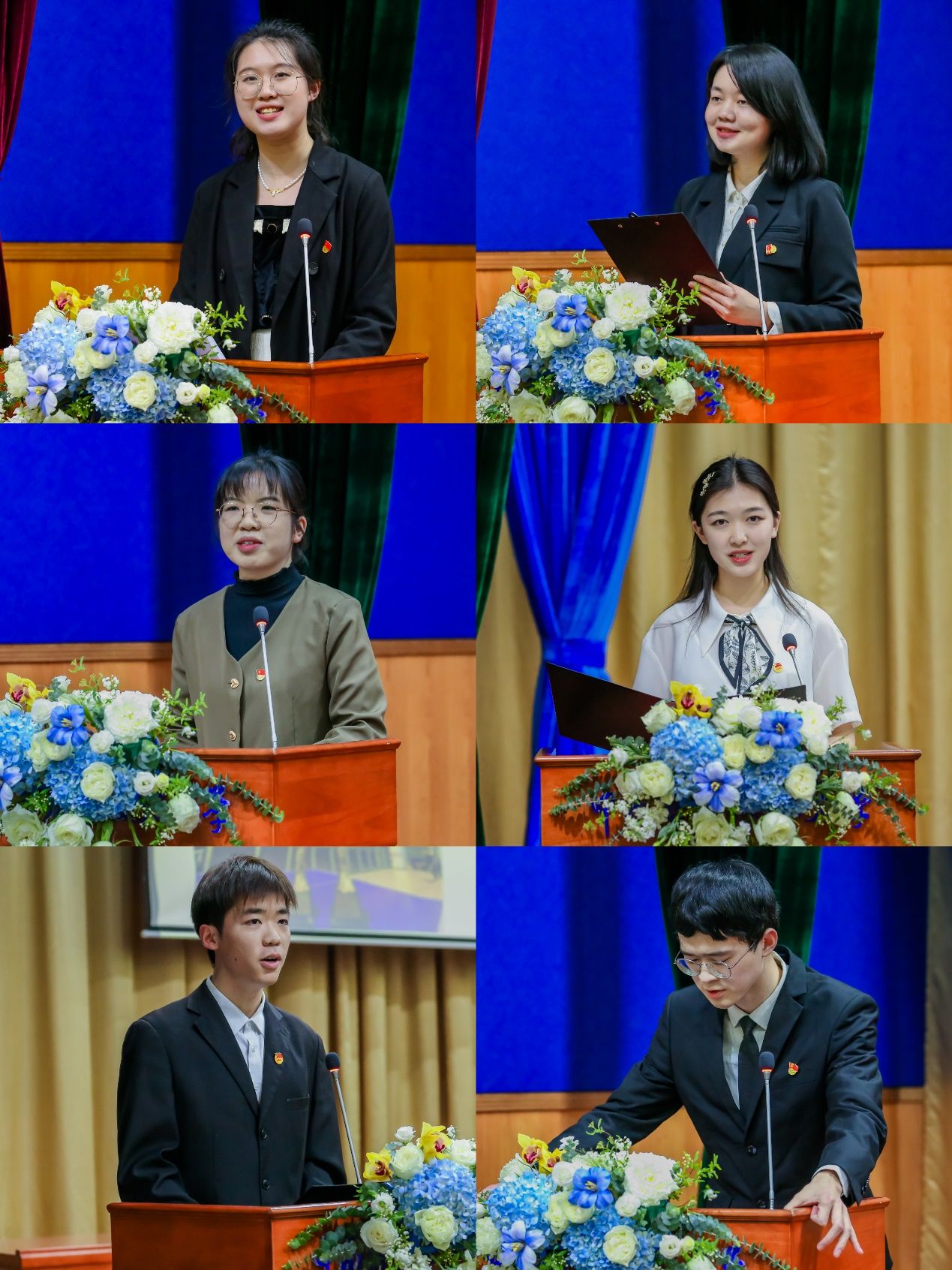 六位获奖学生代表依次走上讲台,述榜样故事,领榜样新风,树青年典范。同梦金融获奖代表黄兰茜以“信仰的味道”贯穿全程,通过“团结实干的真理之甜”“勤学活用的学理之香”和“奉献服务的精神之甘”讲述自己三年来的积淀与成长。同育金融获奖代表杨育蓓介绍了她与伴学坊共同成长、互相成就的故事,朋辈讲师们举办学习沙龙、制作课程讲义、推送每日一题、发起经验分享,用“朋辈共成长”领衔“同育金融”。同行金融获奖代表陈佳蕙从扎实的专业学习和各项实践实训践行知行合一,最终获国际组织实习名额,让世界听到中南大学子的声音。同向金融获奖代表国金2101团支书刘若曦分享了支部 “同讲一堂微课”、“红歌献唱祖国”……作为湖北省活力团支部,用一张张奖状、一份份荣誉凝结出筑梦报国、青春绽彩的故事。同心金融获奖代表程志鹏分享了自己兼顾学习和文体的故事,他在单调的训练中听得青春的回响,在斩获各大奖项继续怀着对文体活动的热爱前往厦门大学深造。同励金融自强之星代表张毅于苦难中开花、在荆棘中绽放,无畏前路难、不坠青云志,在被光照亮的同时,也在用行动照亮他人,用“无愧青春”践行“同励金融”。